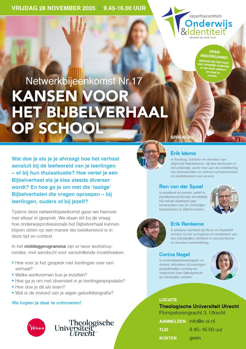 Daarover gaan we op 28 november met elkaar in gesprek tijdens een netwerkbijeenkomst van het Expertisecentrum Onderwijs & Identiteit. De bijeenkomst wordt georganiseerd door de Theologische Universiteit Utrecht, Verus en Kwintessens. Erik Idema (directeur uitgever van Kwintessens) verzorgt de hoofdlezing over kansen voor het Bijbelverhaal. Erik Renkema (Verus), Ron van de Spoel (Theoloog) en Corina Nagel (Godsdienstpedagoog) reageren vanuit verschillende perspectieven. In het middagprogramma zijn er workshops waarin we met elkaar in gesprek gaan.